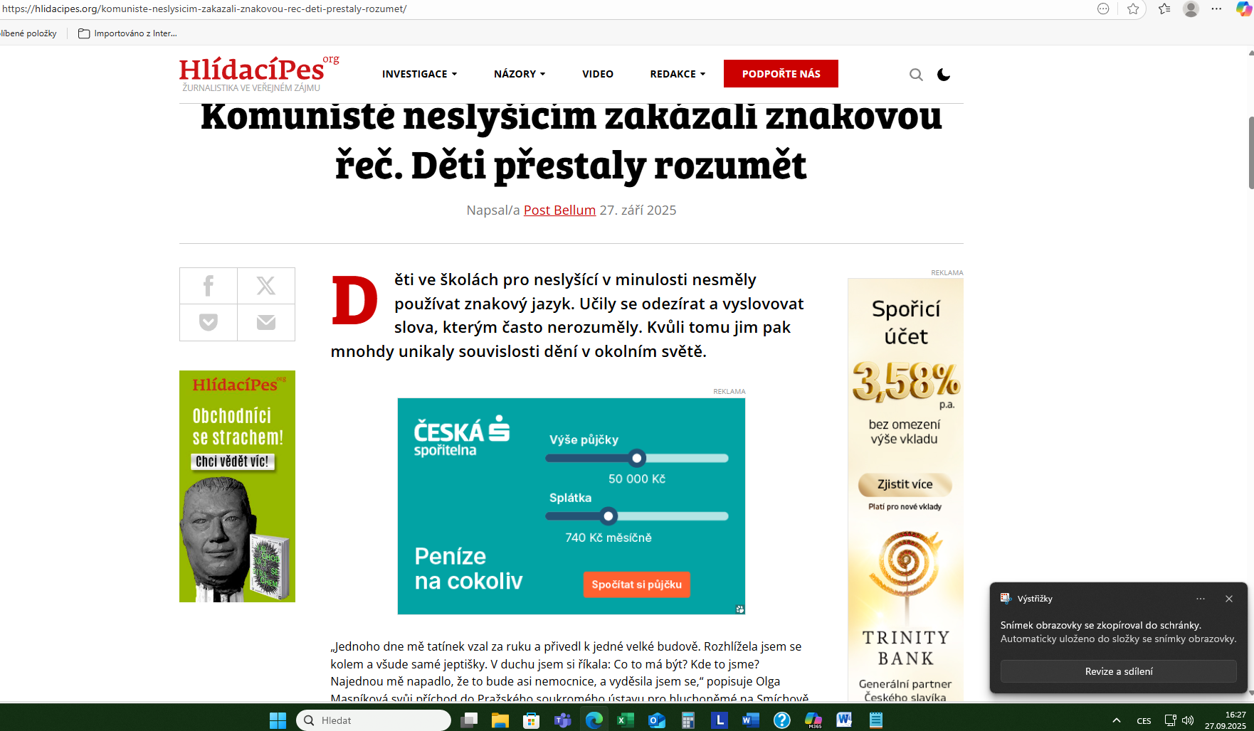 Na webu Hlídací pes s podtitulkem Žurnalistika ve veřejném zájmu oznamuje Barbora Šťastná, pracovnice projektu Paměť národa svůj objev: "Komunisté neslyšícím zakázali znakovou řeč. Děti přestaly rozumět. (Napsal/a Post Bellum 27. září 2025"